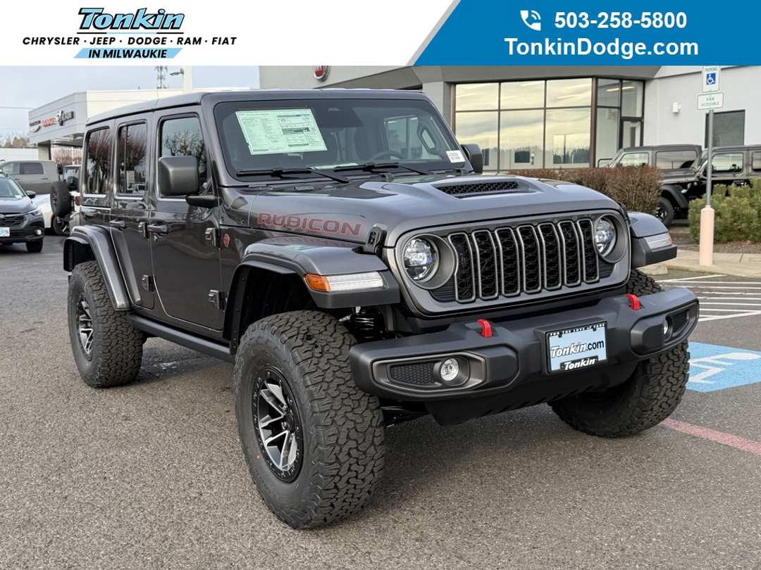 $3,468 off MSRP!2026 Jeep Wrangler Rubicon granite crystal metallic clearcoat 12.3" Touchscreen Display, 35" Tire Suspension, 4-Wheel Disc Brakes, 4G LTE Wi-Fi Hot Spot, 8 Speakers, ABS brakes, Air Conditioning, AM/FM radio: SiriusXM with 360L, Anti-Lock 4-Wheel Disc Perf Brakes, Apple CarPlay, Apple CarPlay/Android Auto, Auto High Beam Headlamp Control, Automatic temperature control, Aux Battery, Auxiliary Switches, Blind Spot and Cross Path Detection, Body Color 3-Piece Hard Top, Body Color Rubicon Highline Flare, Brake assist, Class II Receiver Hitch, Cloth Low-Back Bucket Seats, Compass, Connectivity - US/Canada, Convenience Group, Custom Fuel Wheels and Off-Road Tires, Delay-off headlights, Driver door bin, Driver vanity mirror, Dual front impact airbags, Dual front side impact airbags, Electronic Stability Control, Emergency communication system: Jeep Connect, For More Info, Call 800-643-2112, Freedom Panel Storage Bag, Front anti-roll bar, Front Bucket Seats, Front Center Armrest w/Storage, Front dual zone A/C, Front fog lights, Front License Plate Bracket, Front reading lights, Fully automatic headlights, Google Android Auto, Heated door mirrors, Heated Front Seats, Heated Steering Wheel, Illuminated entry, Integrated Center Stack Radio, Integrated roll-over protection, Low tire pressure warning, MOPAR All-Weather Floor Mats, MOPAR Hinge-Gate Reinforcement, MOPAR Jack Spacer, MOPAR Tire Relocation Kit, Myflexcare Service Plan, No Soft Top, Non-Lock Fuel Cap Without Discriminator, Occupant sensing airbag, Outside temperature display, Overhead airbag, Panic alarm, ParkSense Rear Park Assist System, ParkView Rear Back-Up Camera, Passenger door bin, Passenger vanity mirror, Performance Hood, Performance Suspension, Power door mirrors, Power steering, Power windows, Quick Order Package 24R Rubicon, Radio data system, Radio: Uconnect 5 with 12.3" Display, Rear anti-roll bar, Rear reading lights, Rear Window Defroster, Rear Window Wiper/Washer, Remote keyless entry, Safety Group, Security system, SiriusXM Radio Service, SiriusXM with 360L, Speed control, Split folding rear seat, Steel Performance Hood Package, Steering wheel mounted audio controls, Stop-Start Dual Battery System, Tachometer, Telescoping steering wheel, Tilt steering wheel, Traction control, Trip computer, Universal Garage Door Opener, Variably intermittent wipers, Voltmeter, Wheel Flare Extensions, Wheels: 17" x 7.5" Machined/Painted Black, Wheels: 17" x 8" Machined with Black Pockets, Xtreme 35 Tire Package.
