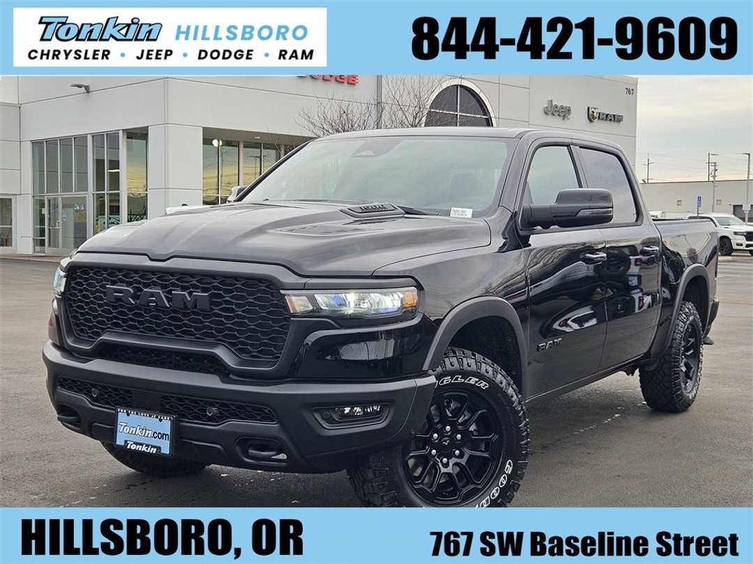 2026 Ram 1500 Rebel Diamond Black Crystal Pearlcoat 3.0L I6 4WD 8-Speed Automatic10 Speakers, 115V Auxiliary Rear Power Outlet, 14.4" Touchscreen Display, 2-Door Passive Entry, Front Door Locks, 3.92 Rear Axle Ratio, 33 Gallon Fuel Tank, 4 Way Front Headrests, 4-Wheel Disc Brakes, 4G LTE Wi-Fi Hot Spot, ABS brakes, Accent Color Door Handles, Accent Color Premium Power Mirrors, Accent Color Tailgate Handle, Active Noise Control System, Air Conditioning, Alloy wheels, AM/FM radio: SiriusXM with 360L, Apple CarPlay, Apple CarPlay/Android Auto, Auto High-beam Headlights, Auto Power-Folding Mirrors, Auto-Dimming Exterior Driver Mirror, Auto-dimming Rear-View mirror, Automatic temperature control, Bed Utility Group, Black Exterior Mirrors, Black Painted Exterior Mirrors Caps, Brake assist, Bucket Seats, Cloth/Vinyl Bucket Seats, Compass, Connected Travel and Traffic Services, Connectivity - US/Canada, Convex Wide-Angle Exterior Mirror Insert, Delay-off headlights, Disassociated Touchscreen Display, Dome Dual LED Reading Lamp, Driver door bin, Driver Seat Memory, Driver vanity mirror, Dual front impact airbags, Dual front side impact airbags, Dual Wireless Charging Pad, Dual-Pane Panoramic Sunroof, Electronic Stability Control, Exterior 115V AC Outlet, Exterior Mirrors Approach Lamps, Exterior Mirrors Courtesy Lamps, Exterior Mirrors with Heating Element, Exterior Mirrors with Memory, Exterior Mirrors with Supplemental Signals, Front anti-roll bar, Front Bucket Seats, Front Center Armrest w/Storage, Front dual zone A/C, Front fog lights, Front License Plate Bracket, Front Passenger Interactive Display, Front reading lights, Front Seat Back Map Pockets, Front wheel independent suspension, Full Length Upgraded Floor Console, Fully automatic headlights, Garage door transmitter, Global Telematics Box Module, Google Android Auto, GPS Antenna Input, GPS Navigation, Harman/Kardon 19 Speaker Premium Sound, HD Radio, Heated door mirrors, Heated Front Seats, Heated front seats, Heated Second Row Seats, Heated Steering Wheel, Heated steering wheel, Illuminated entry, Integrated Center Stack Radio, Integrated Voice Command with Bluetooth, Leather steering wheel, Low tire pressure warning, Manual Folding Exterior Mirrors, Media Hub with 2 Charge Only USBs, MOPAR 4 Adjustable Cargo Tie-Down Hooks, MOPAR Spray in Bedliner, MyFlexCare Service Plan, Navigation System, Occupant sensing airbag, Off-Road Information Pages, Outside temperature display, Overhead airbag, Overhead console, Panic alarm, ParkView Rear Back-Up Camera, Passenger door bin, Passenger vanity mirror, Power 2-Way Driver Lumbar Adjust, Power 2-Way Passenger Lumbar Adjust, Power Adjust 8-Way Driver Seat, Power Adjust 8-Way Front Passenger Seat, Power Adjustable Pedals with Memory, Power door mirrors, Power driver seat, Power steering, Power Tailgate, Power windows, Proximity Approach/Departure Lamps, Quick Order Package 21W Rebel, Radio data system, Radio: Uconnect 5 Nav with 14.4" Display, Radio: Uconnect 5 Navigation with 12.0" Display, Radio/Driver Seat/Mirrors/Pedals Memory, Rain Sensitive Windshield Wipers, Rear 60/40 Folding Seat, Rear anti-roll bar, Rear seat center armrest, Rear step bumper, Rear Window Defroster, Rebel Level 2 Equipment Group, Remote keyless entry, Security Alarm, SiriusXM Radio Service, SiriusXM with 360L, Smartphone as a Key Capable, Speed control, Split folding rear seat, Steering wheel mounted audio controls, Tachometer, Telescoping steering wheel, Tilt steering wheel, Traction control, Trailer Brake Control, Trip computer, USB Host Flip, Variably intermittent wipers, Voltmeter, Wheels: 18" x 8.0" Painted Mid-Gloss Black. Price includes: $1000 - 2026 National Bonus Cash . Exp. 03/02/2026 $3500 - 2026 National Retail Consumer Cash . Exp. 03/02/2026