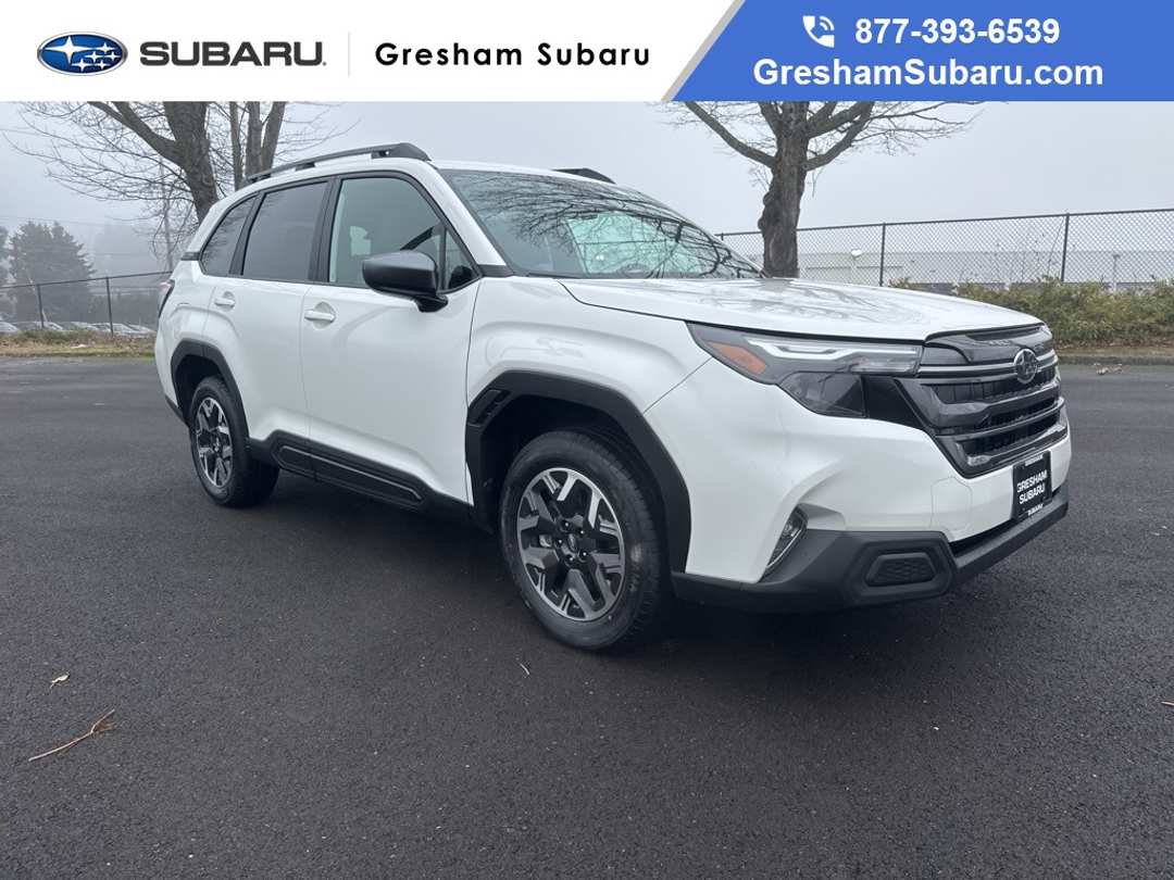 4-Wheel Disc Brakes, 6 Speakers, ABS brakes, Air Conditioning, All-Weather Floor Liners, Alloy wheels, AM/FM radio: SiriusXM with 360L, Anti-whiplash front head restraints, Auto High-beam Headlights, Automatic Emergency Steering, Automatic temperature control, Blind-Spot Detection (BSD)/RCTA System, Brake assist, Bumpers: body-color, Cargo Tray, Driver door bin, Driver vanity mirror, Dual front impact airbags, Dual front side impact airbags, Electronic Stability Control, Emergency communication system: MySubaru Companion (5-years free), Emergency Lane Keep Assist, Exterior Parking Camera Rear, Four wheel independent suspension, Front anti-roll bar, Front Bucket Seats, Front Center Armrest, Front dual zone A/C, Front fog lights, Front reading lights, Fully automatic headlights, Heated door mirrors, Heated Front Bucket Seats, Heated front seats, Illuminated entry, Knee airbag, Leather steering wheel, Low tire pressure warning, Occupant sensing airbag, Outside temperature display, Overhead airbag, Overhead console, Panic alarm, Passenger door bin, Passenger vanity mirror, Power door mirrors, Power driver seat, Power moonroof: Panoramic, Power Rear Gate, Power Rear Gate and Blind Spot Detection with Rear Cross Traffic Alert, Power steering, Power windows, Premium Textured Cloth Upholstery, Radio data system, Radio: Subaru 11.6" Multimedia Plus System, Rear anti-roll bar, Rear Bumper Cover, Rear seat center armrest, Rear window defroster, Rear window wiper, Remote keyless entry, Security system, Speed control, Speed-sensing steering, Split folding rear seat, Spoiler, Steering wheel mounted audio controls, Tachometer, Telescoping steering wheel, Tilt steering wheel, Traction control, Trip computer, Variably intermittent wipers, Wheels: 17" x 7.0 J Dark Metallic Aluminum-Alloy. 2026 Subaru Forester Premium 4D Sport Utility Lineartronic CVT 2.5L 4-Cylinder DOHC 16V AWD Crystal White PearlVisit Gresham Subaru online at www.GreshamSubaru.com and see why we service Portland and Vancouver as The BIG Subaru Store with the SMALL Prices!!!