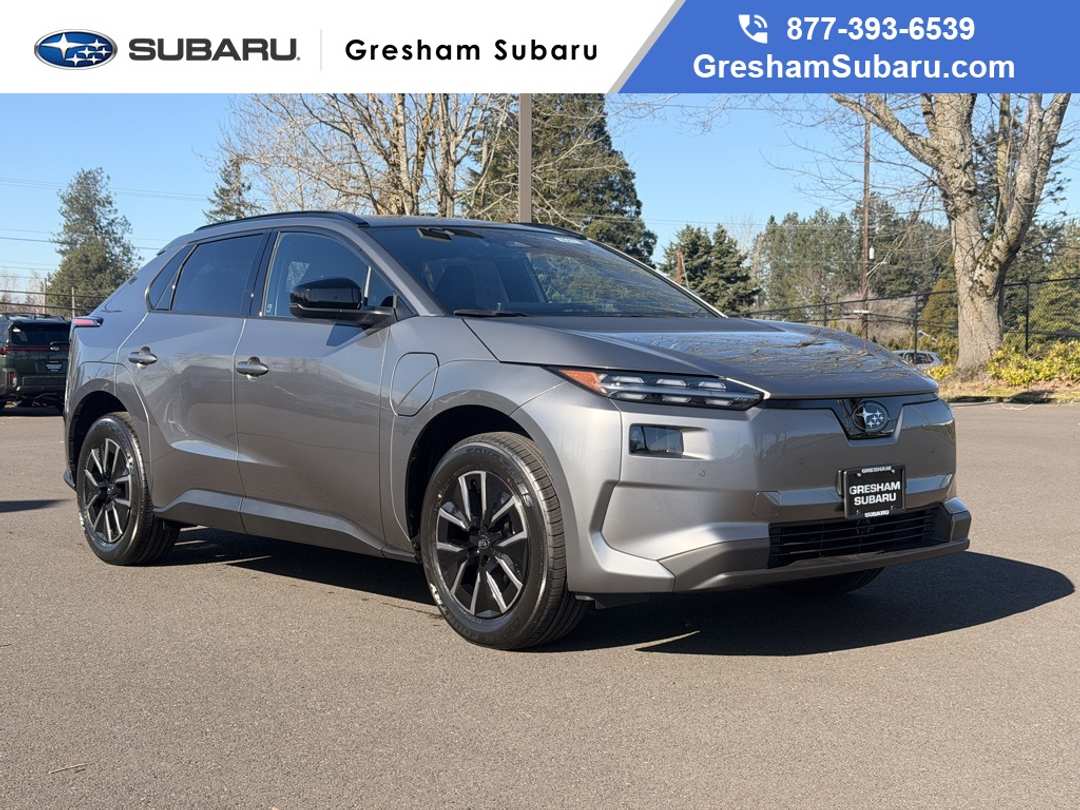 4-Wheel Disc Brakes, 6 Speakers, ABS brakes, Air Conditioning, Alloy wheels, AM/FM radio: SiriusXM, Apple CarPlay & Android Auto, Auto High-beam Headlights, Auto-dimming Rear-View mirror, Automatic temperature control, Brake assist, Bumpers: body-color, Driver door bin, Driver vanity mirror, Dual front impact airbags, Dual front side impact airbags, Electronic Stability Control, Emergency communication system, Exterior Parking Camera Rear, Four wheel independent suspension, Front anti-roll bar, Front Bucket Seats, Front Center Armrest, Front dual zone A/C, Front reading lights, Fully automatic headlights, Garage door transmitter: HomeLink, Headlight cleaning, Heated door mirrors, Heated Front Bucket Seats, Heated front seats, Illuminated entry, Knee airbag, Leather steering wheel, Low tire pressure warning, Navigation System, Occupant sensing airbag, Outside temperature display, Overhead airbag, Overhead console, Panic alarm, Passenger door bin, Passenger vanity mirror, Power door mirrors, Power driver seat, Power Liftgate, Power steering, Power windows, Radio data system, Radio: : Subaru 14" Multimedia System, Rain sensing wipers, Rear anti-roll bar, Rear reading lights, Rear seat center armrest, Rear window defroster, Remote keyless entry, Security system, Speed control, Speed-sensing steering, Split folding rear seat, Spoiler, StarTex Upholstery, Steering wheel mounted audio controls, Telescoping steering wheel, Tilt steering wheel, Traction control, Trip computer, Turn signal indicator mirrors, Variably intermittent wipers, Wheels: : 18" x 7.5" J Aluminum-Alloy. Recent Arrival! 2026 Subaru Solterra Premium 4D Sport Utility 1-Speed Automatic Electric Motor AWD CarbonVisit Gresham Subaru online at www.GreshamSubaru.com and see why we service Portland and Vancouver as The BIG Subaru Store with the SMALL Prices!!!