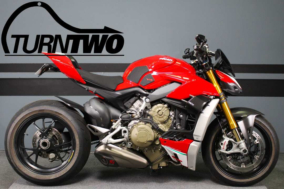 2021 Ducati Streetfighter V4 S in classic Ducati Red, nicely upgraded with custom tricolore graphics, smoked windscreen, CRG bar-end mirrors, CNC carbon-fiber wings, tank grip pads, tail tidy, and an Akrapovic exhaust, ready for your next track day!
